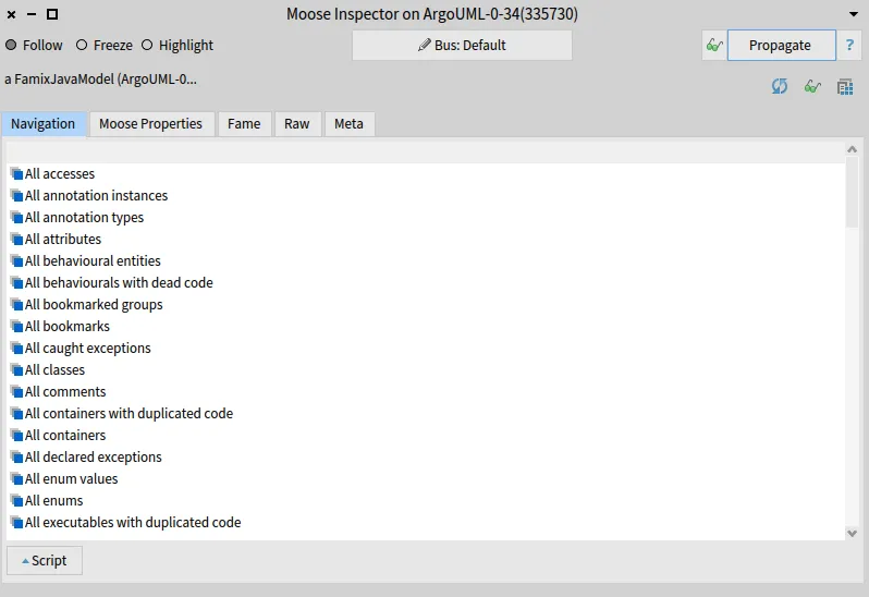Click on the JSON button on the top right and load the ArgoUML-0-34.json file. You need to tell Moose what Famix Meta-Model to use for this file. Here you want the Java Meta-Model, hence the FamixJavaModel.